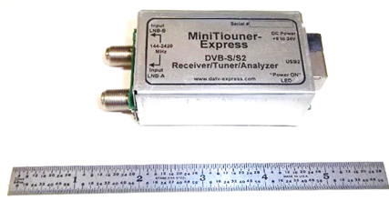 It has two "F" female RF inputs to receive up to two simultaneous independent signals viewed one at a time with A or B soft keys in the MiniTioune software downloaded at: http://www.vivadatv.org. The resultant video and diagnostics are then shown on the computer monitor display. There are provisions to source a DC voltage on either or both RF connectors to power a preamplifier at the antenna. Since the MiniTiouner-Express itself will operate from a +8 to +24VDC source, the preamp voltage requirements dictate the MiniTiouner-Express supply voltage.