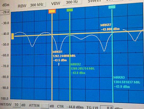 | Sweep of the loop antenna, the reference point was -30dbm. The -43dbm line represents -13dbm of return loss or 1.5:1 VSWR. as you an see most of the antenna sweep is well below that line indicaing the antenna is fairly broad. | |